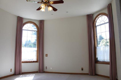 The Master enjoys the upstairs part of the angled Tower effect, with multiple tall, arched, grid windows to welcome in the sun and beautiful landscaped views. It enjoys a ceiling fan, and mirrored-closet lined walkway to the large Master bath. One of the closets has a walk-in feature. The bath area has double custom sinks, and an enormous tiled shower with 2 separate shower heads, and arched view windows...fit for royalty!
