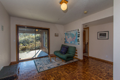 Off the great room is a small family room for more informal gatherings or TV watching. It enjoys hardwood parquet flooring, storage under the stairs for games or linens, and a slider out to a separate patio.